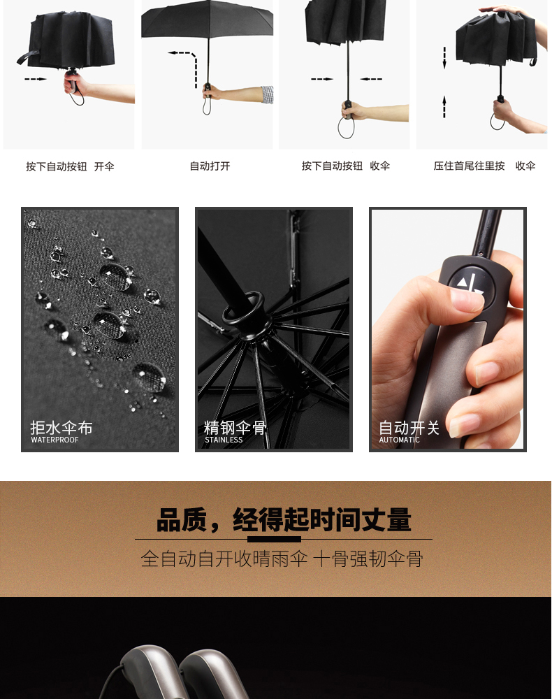 特別提醒:傘自動合上后,需要將傘柄收回來,方可再次自動開傘。